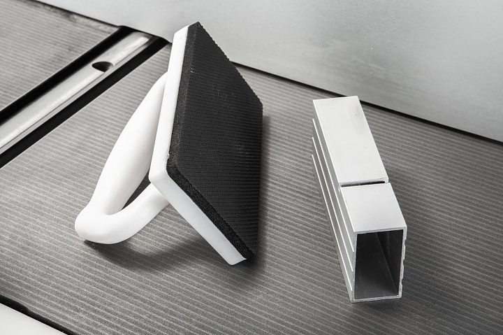 Фугование и рейсмусование производятся как обычно – каких-либо специальных приемов работы не требуется; переналадка почти не занимает времени. Верхний фуговальный модуль, объединяющий в себе оба стола и механизм регулировки глубины строгания, полностью откидывается (при этом ранее сделанные настройки не сбиваются), кожух стружкоудаления переворачивается. Компоновка с откидным верхом дает преимущества как в работе (лучше обзор, более качественно работает стружкоудаление), так и при обслуживании строгального вала, доступ к которому ничем не затруднен.